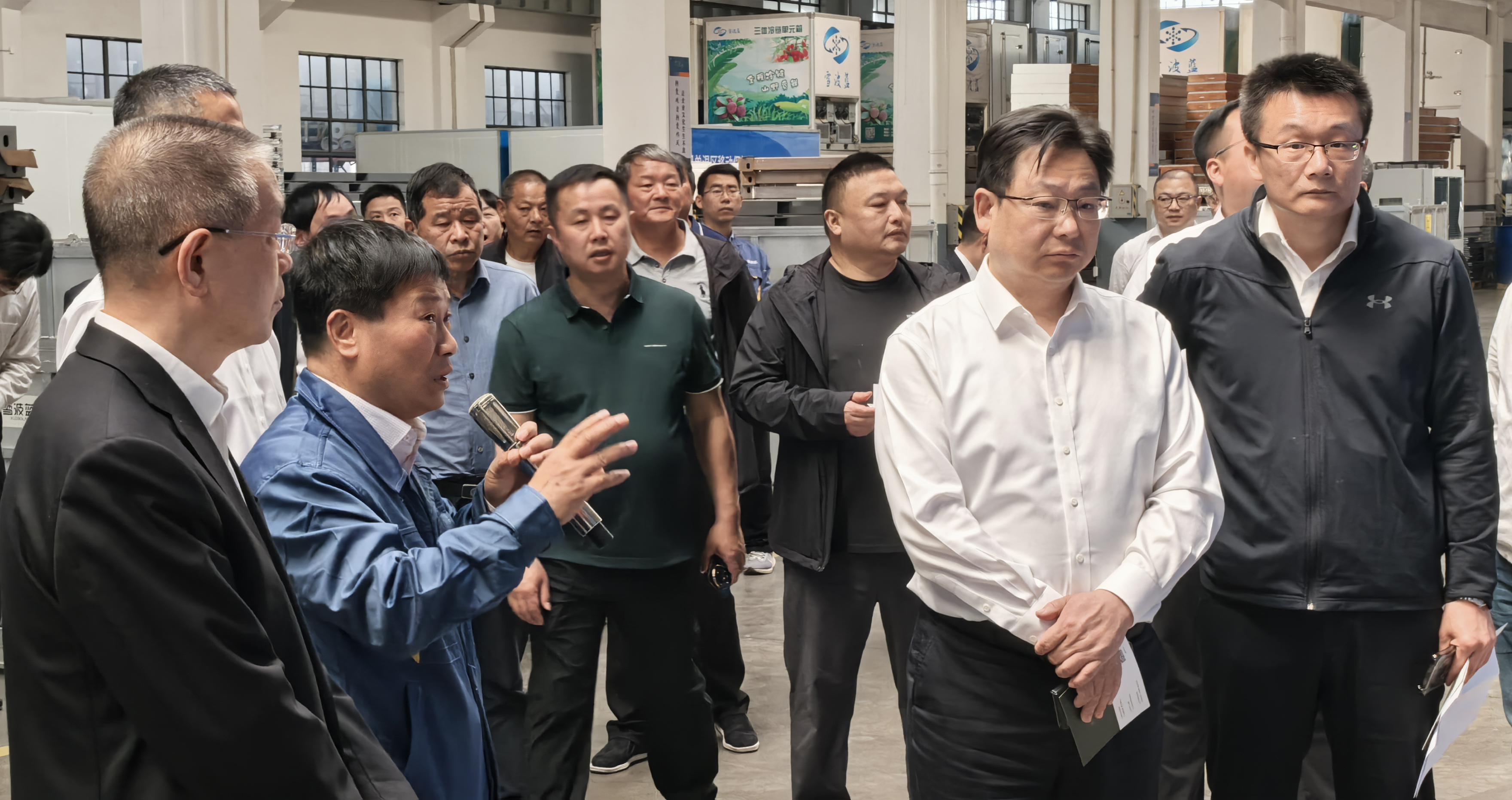 考察團(tuán)在雪波藍(lán)董事長陳金紅、總經(jīng)理陳倍的陪同下,先后深入智能展廳與生產(chǎn)車間,通過企業(yè)負(fù)責(zé)人的現(xiàn)場講解、設(shè)備實(shí)操演示,全面了解了冷鏈技術(shù)如何解決農(nóng)產(chǎn)品 “上行難” 的問題,以及 “村集體 + 企業(yè) + 銀行” 的協(xié)同合作如何落地等事宜。